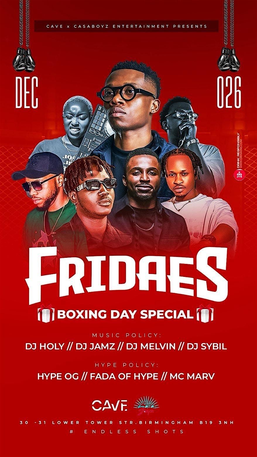 Get ready for an epic Boxing Day bash like no other! Join us in person for a night full of fun, music, and great vibes. Whether you're looking to dance the night away or just chill with friends, this event is the perfect way to keep the holiday spirit alive. Don't miss out on the FRIDAES Boxing Day Special – it’s gonna be a blast!