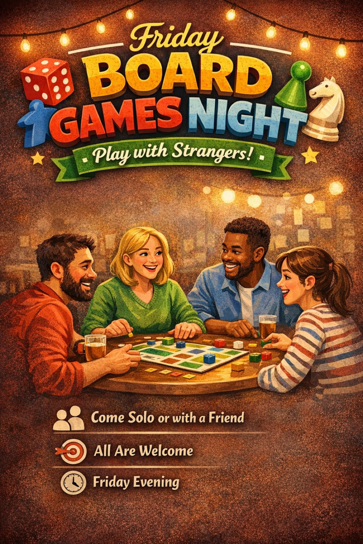 Join us this Friday for a relaxed and friendly Board Games Night, where you donโt need to come with a group โ just bring yourself. Weโll mix tables, explain the games, and help everyone jump right in.