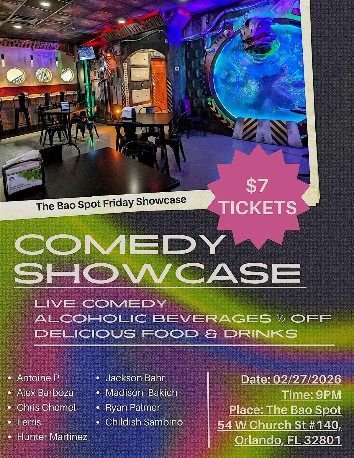 Come join us for a night of laughter, and good vibes at The Bao Spot! Our Comedy Showcase is the perfect opportunity to laugh with friend while enjoying a mothwatering meal. We have comedians of all ranges; seasoned performers or newer comics, but they are gurenteed to make you smile. A five minute walk from the Kia Center where the Orlando Magic play, so pop in after the game. Grab your friends, grab a bao, and let's make some memories together! FREE ENTRY W/ Food & Drink Purchases over $11 @ The Bao Spot on day & time of the show.