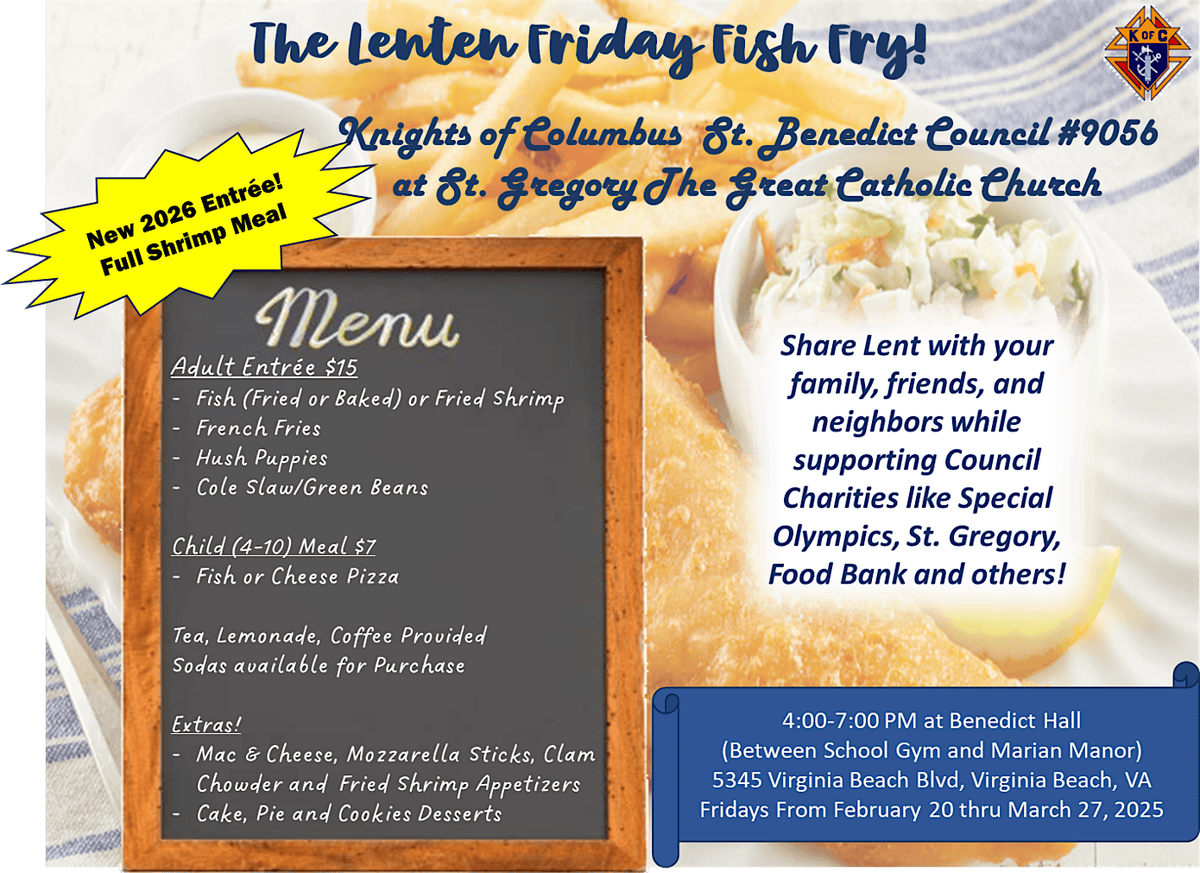 Join family, friends and neighbors for a traditional Lenten Fish Fish any or every Friday from 20 Feb through Mar 27 at the Hall by St. Greg