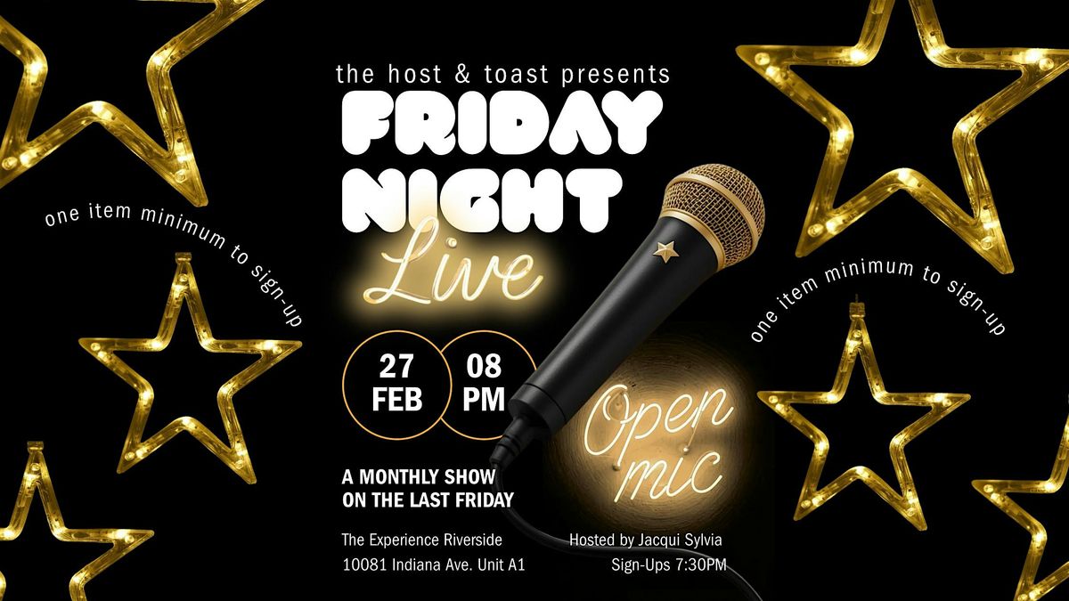 Welcome to Friday Night Live Comedy Open Mic at The Experience Riverside! Get ready for a night filled with laughter and good vibes. Join us on EVERY FINAL FRIDAY OF THE MONTH AT 8PM SIGN-UPS 7:30 (Pacific Time) for a lineup of talented comedians ready to tickle your funny bone. Whether you're a comedy enthusiast or just looking for a fun night out, this event is perfect for everyone. Don't miss out on this opportunity to enjoy live comedy in a cozy atmosphere. See you there!