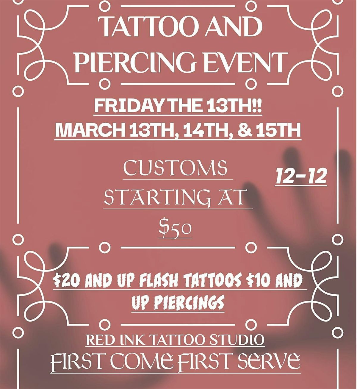 FRIDAY THE 13TH $20 AND UP FLASH TATTOOS AND PIERCINGS MARCH 13TH,14TH,15TH