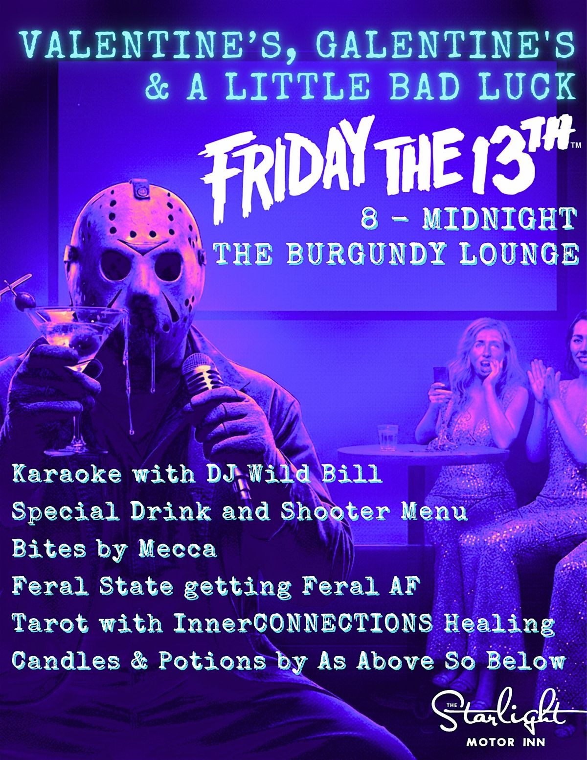 We're throwing a party this Friday the 13th! Join us at the Starlight Motor Inn for karaoke with DJ Wild Bill, bites by Mecca, tarot from Innerconnections Healing, and more! There is no cover fee to enter this party-- so whether you are celebrating with your girls, your boo, or trying to hex your ex-- all are welcome!
