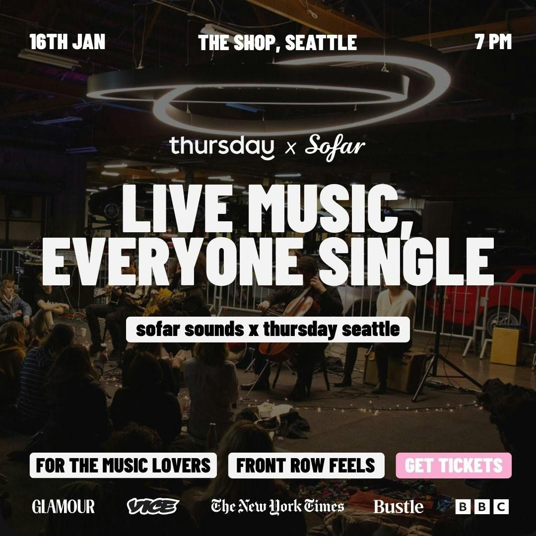 On Friday, January 16, Sofar Sounds and Thursday are teaming up for a live music night with 100+ singles, where everyone in the room is single and the music leads the way. A surprise artist performs an intimate set, the sound fills the space, and conversations happen naturally between songs.