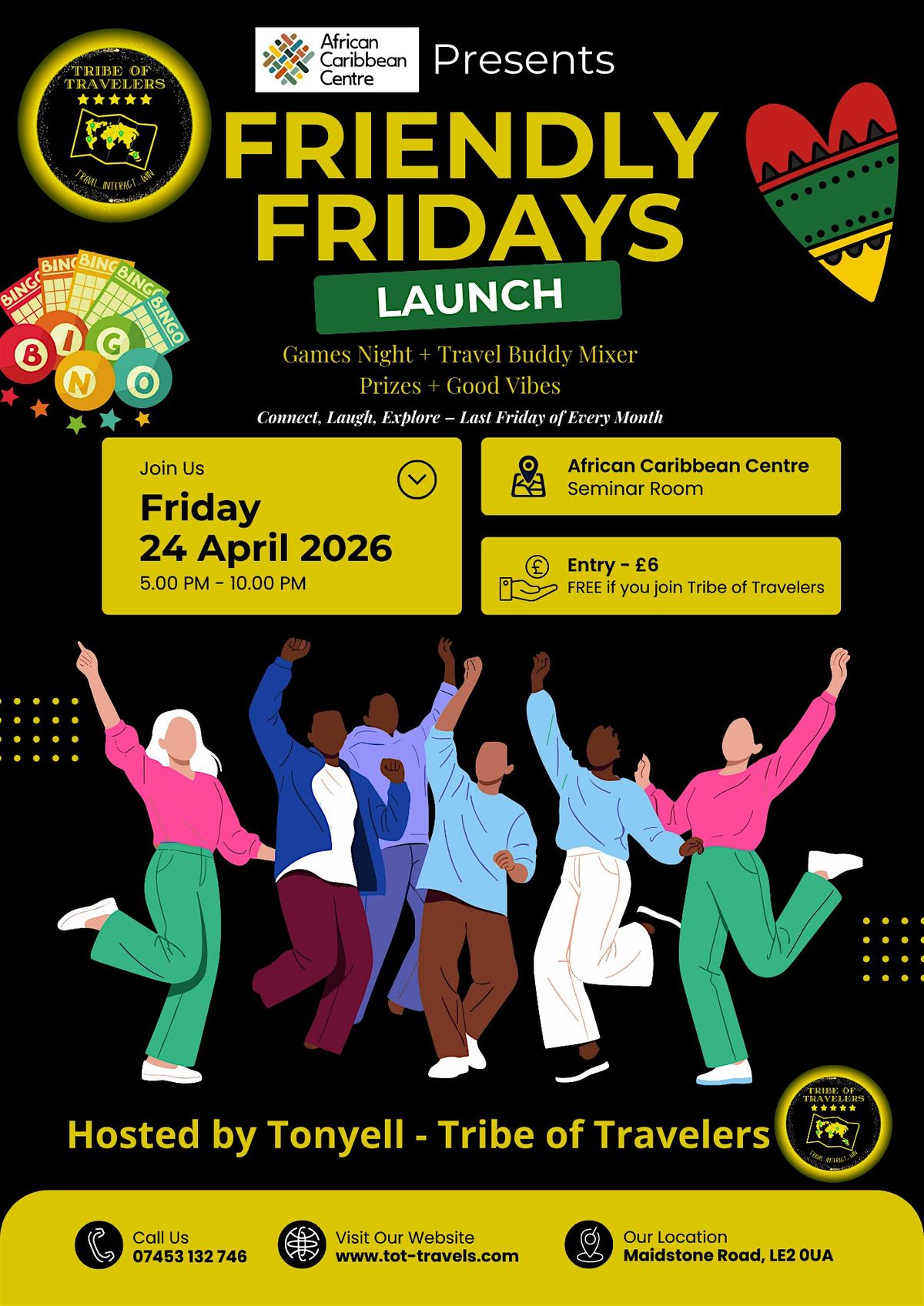Friendly Fridays is a monthly social night at the African Caribbean Centre, created for grown folks who love culture, connection, and good vibes. Each month features two rotating themes — from Games Night and Travel Mixers to Karaoke, Culture Nights, Costume Parties, and more.
