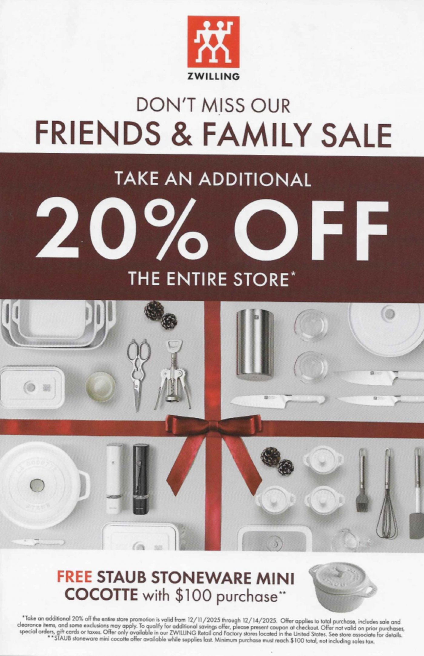 Join us at the incredibly anticipated "Friends and Family Sale" brought to you by Zwilling JA Henckels, featuring the exceptional Zwilling Spectrum knives or Miyabi Iki knives! This exclusive event is designed to elevate your holiday shopping experience with top-notch quality knives perfect for Christmas presents.
