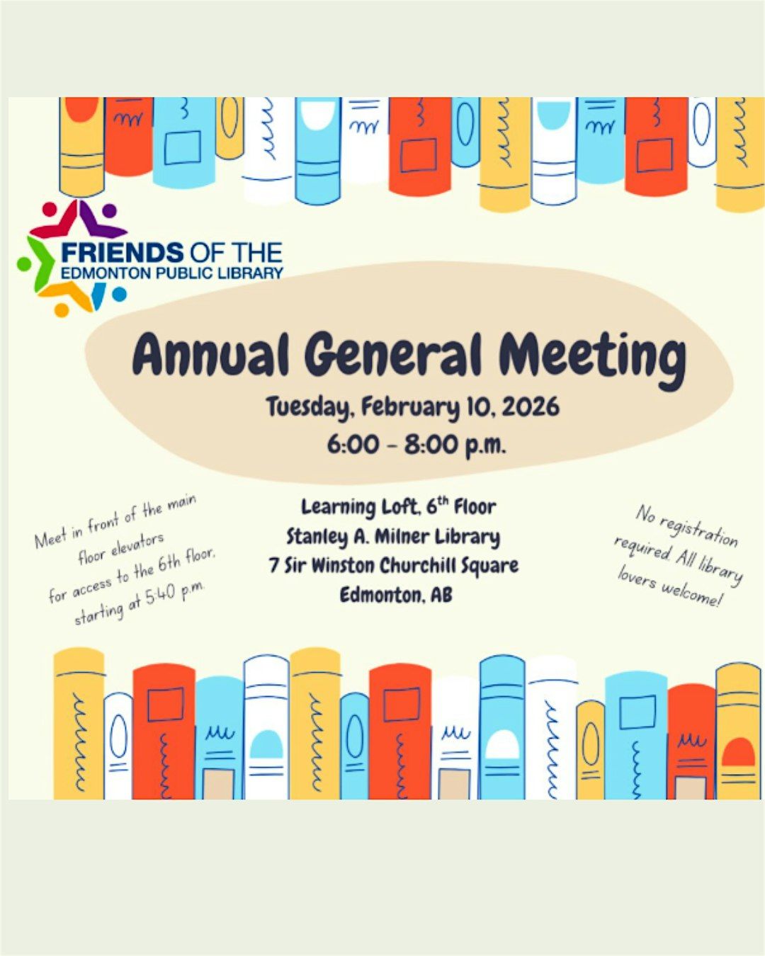 Join us in person in the learning loft on the 6th floor for the Friends of the Edmonton Public Library Annual General Meeting! It's a great chance to catch up, share your ideas, and learn about upcoming plans to support our beloved library. Don’t miss out on connecting with fellow library enthusiasts and making a difference together. See you there!