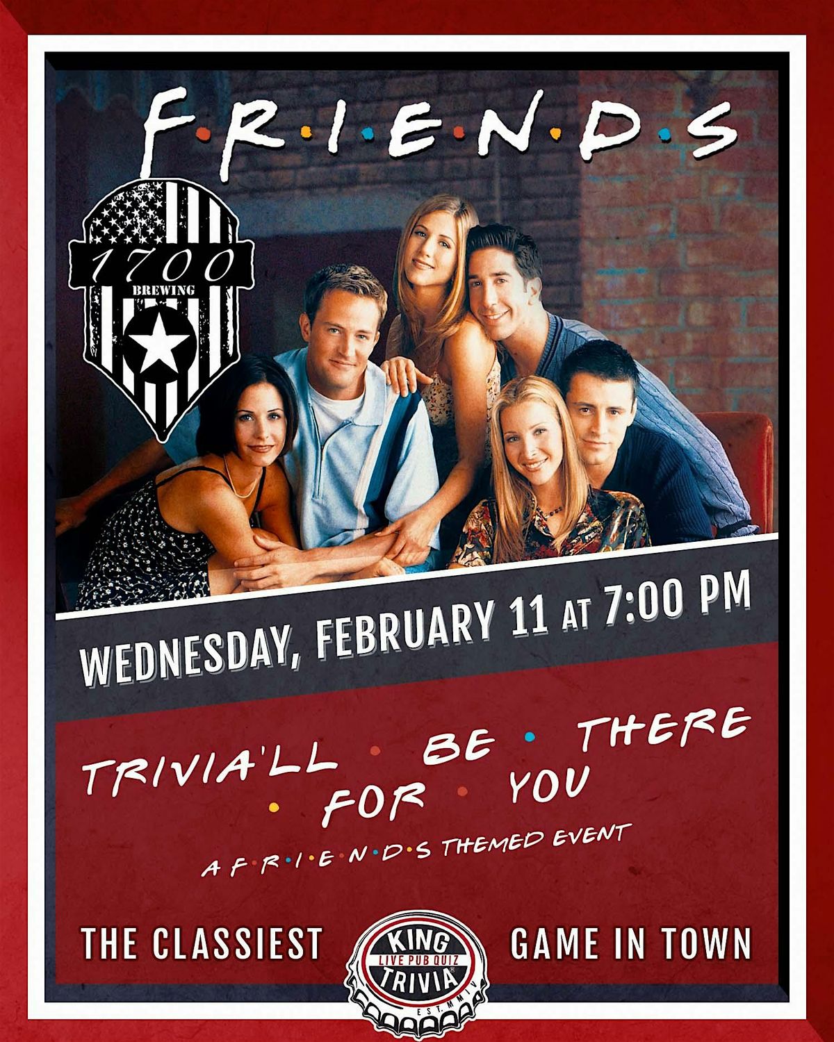 Get ready for a super fun in-person night filled with laughs, challenges, and friendly competition! Join us at 1700 Brewing for an awesome trivia event all about the classic show Friends. Bring your crew, test your knowledge, and enjoy some great brews while you're at it. Whether you're a Ross expert or a Joey fan, this night is all about good vibes and great company. Don't miss out!