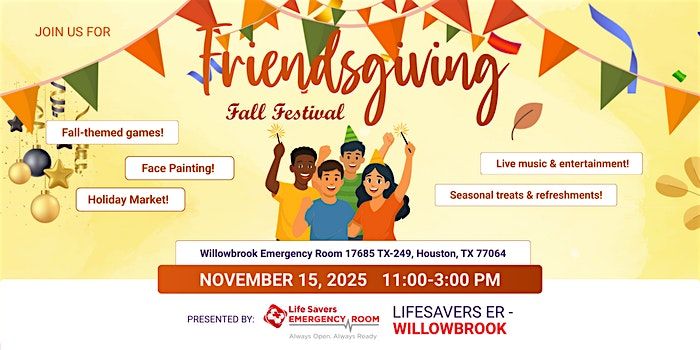 Celebrate the season of gratitude at our Friendsgiving Fall Festival! LifeSavers ER – Willowbrook invites you and your family to enjoy a day of community, laughter, and holiday cheer. This special event is the perfect way to kick off the holidays with friends, neighbors, and loved ones.