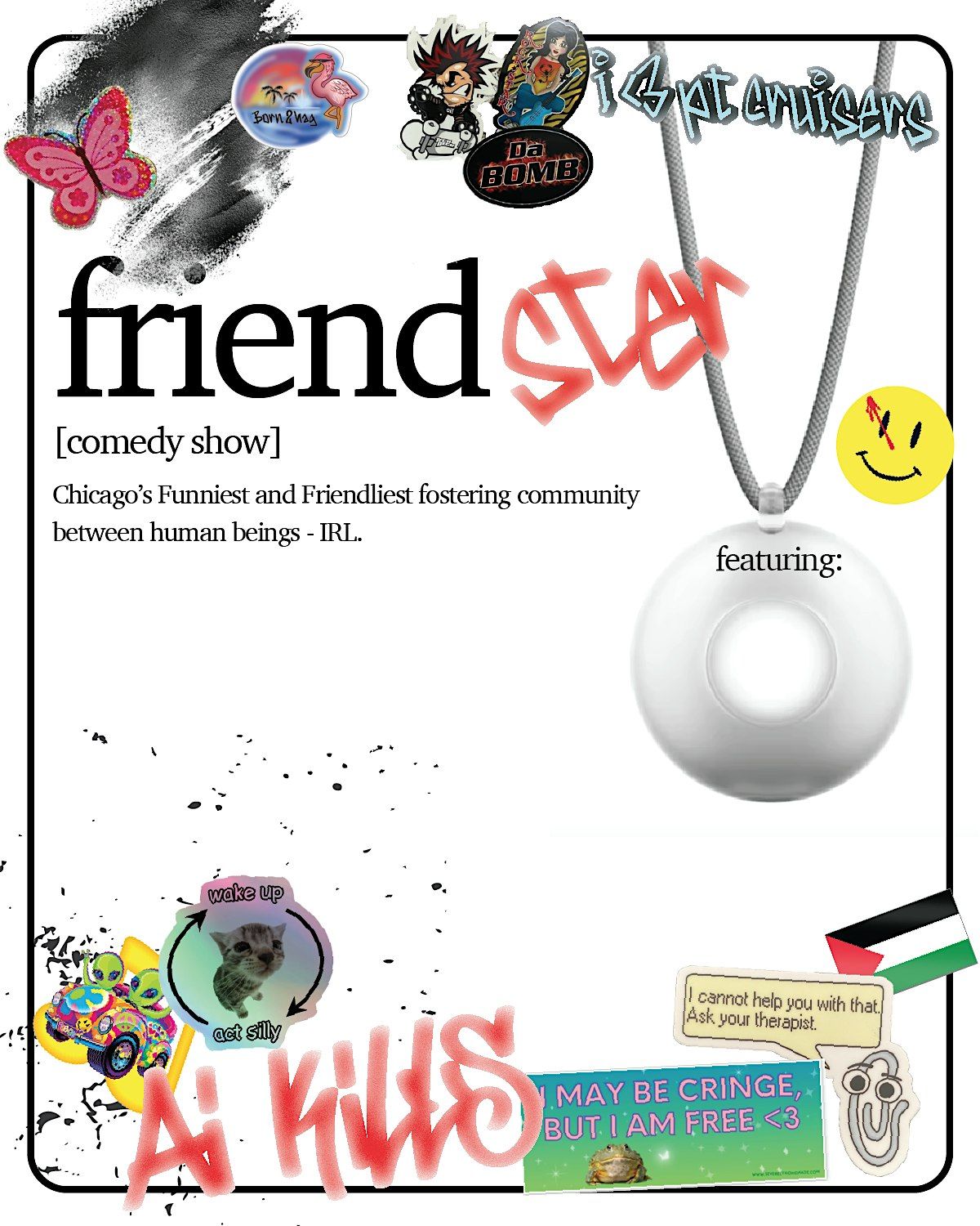 In these increasingly isolating times, IRL-based community is needed more than ever. And what better way to cultivate that than through the power of laughter? From the hearts and minds of Alex Ubalde and Megan Metzger, “Friendster” is a monthly traveling showcase/social mixer where Chicago’s friendliest and funniest comedians regale audiences with tales of group chat drama, workplace crushes, and all the other silly things that make humans human (AI could never).