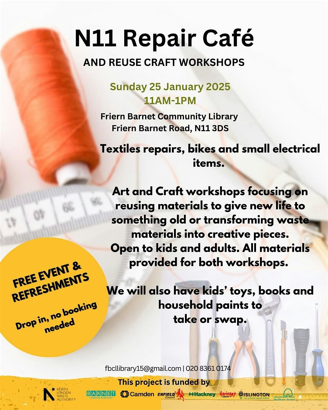 Join us on Sunday, from 11am to 1pm at the Friern Barnet Community Library for a day dedicated to fixing, creating, and reusing! Our monthly Repair Cafe is completely free and the ideal spot to bring your broken items for our talented repairers to fix. Whether it's small electrical devices, bikes, or textiles, we have you covered.