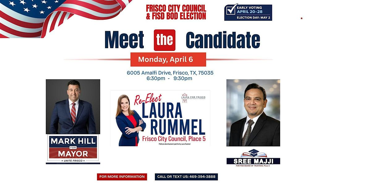 Join us for an informal and engaging evening with local Frisco candidates as we come together as a community to connect, learn, and have meaningful conversations.