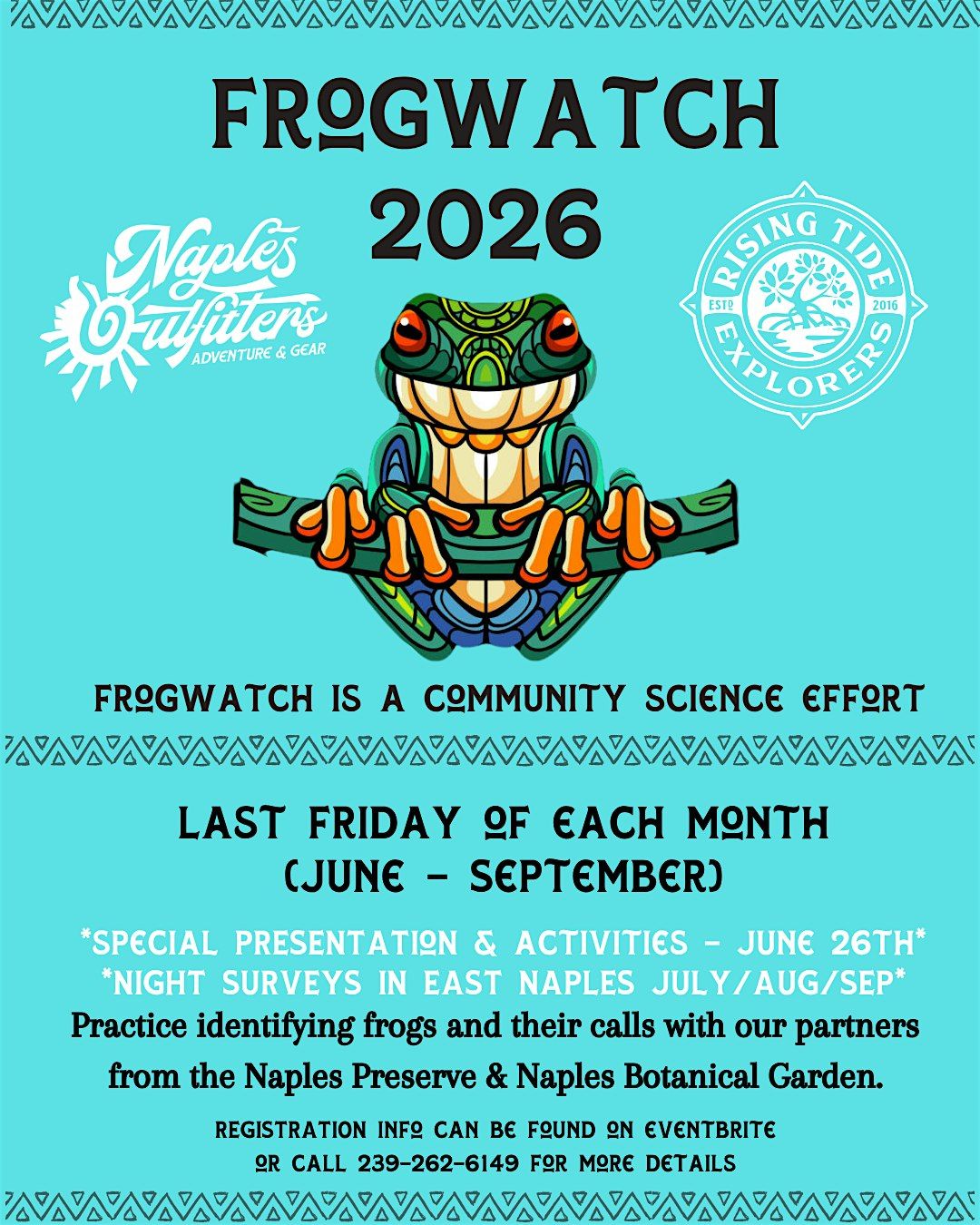 FROGWATCH 2026 IS KICKING OFF WITH a full blown FROGGY FUN event at Naples Outfitters, June 26th at 5pm. Becky Speer from the Naples Preserve will walk us through the idea behind Frog Watch, the big picture of how widespread it actually is, and what we hope to find on our surveys during the summer. Rising Tide Explorers, Naples Botanical Gardens and other partners will also be onsite with activities and information. This is your opportunity to learn about our local frog species AND practice listening (and looking) for them. Additional information for "field dates" will be announced at this event!