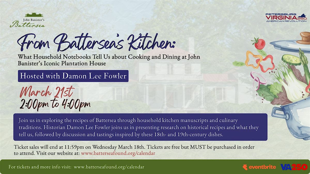This special program is part of our VA250 celebrations, and will bring research to life through a culinary history event. The first half will feature a talk by author, Damon Lee Fowler, exploring 18th century culinary traditions at homes like Battersea, drawing directly from original recipes that were once stored in the kitchen building. Guests will learn about historic cooking practices and translated recipes that reveal how food was planned, prepared, and presented. Following the lecture, attendees will enjoy tastings inspired by these historic recipes with the opportunity for discussion and Q&A.