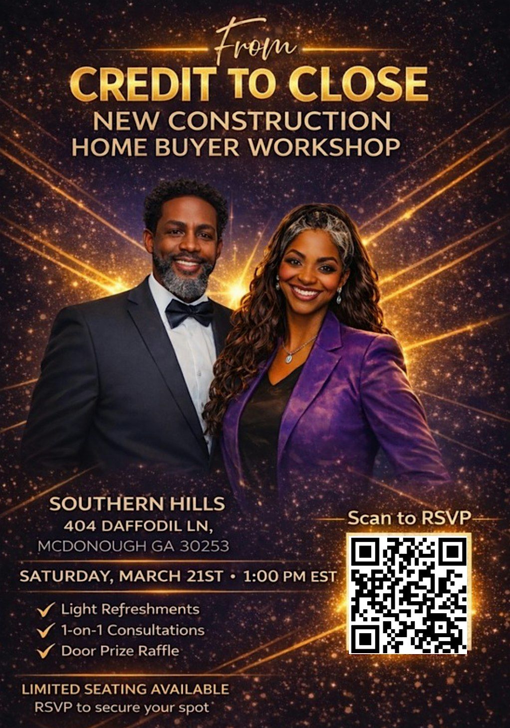 Join us for From Credit to Close: New Construction Home Buyer Workshop in Metro Atlanta! This in-person event is perfect if you want to understand the journey from boosting your credit score to closing on your dream new construction home. Get tips, ask questions, and learn the insider secrets to make your home buying experience smooth and exciting. Don’t miss out on this chance to get empowered and confident in your home buying game!