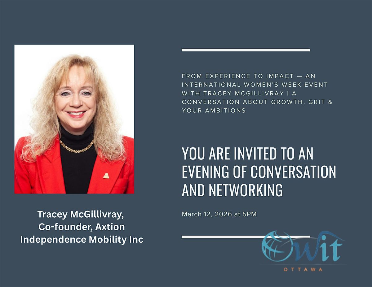 Info: MC Joanna Davies, Managing Director, Polaris Advantage, a Top 20 Women in Canadian Defence, 2023, and OWIT Ottawa board member, will host a conversation and Q&A with Tracey McGillivray, founder of Axtion Mobility Inc., a systems engineer by training, and a recent success on Dragon's Den Canada for their Raymex mobility system.