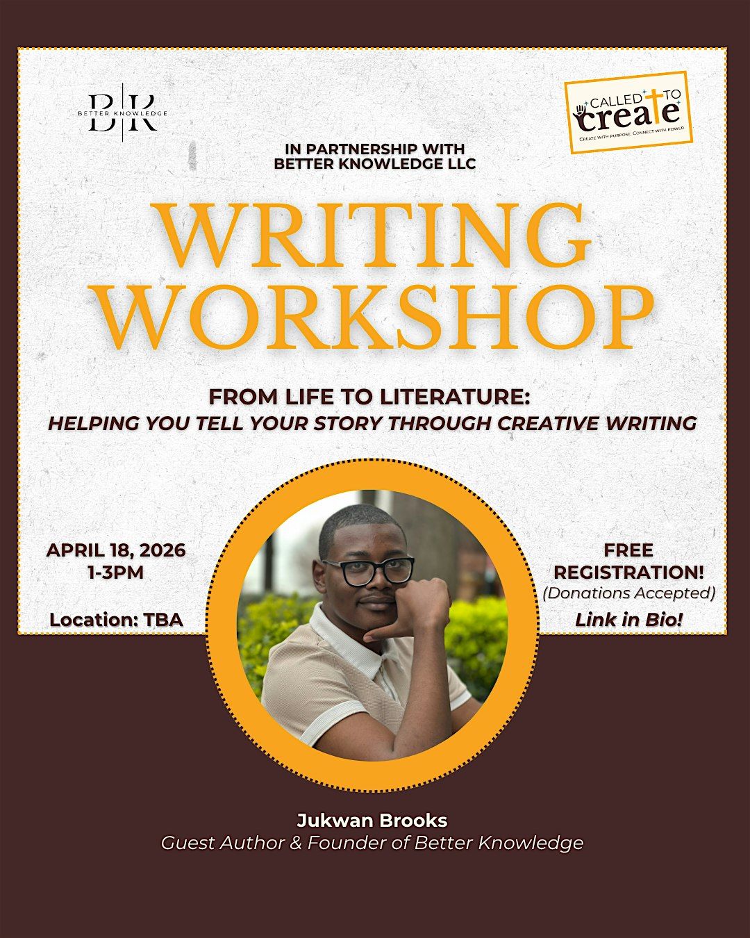 In partnership with published author Jukwan Brooks, founder of Better Knowledge, this workshop will guide you through the process of turning your testimony into meaningful narrative. Known for writing fiction inspired by his real-life journey, Jukwan will share insight into how he transforms personal experiences into compelling stories that connect and inspire.