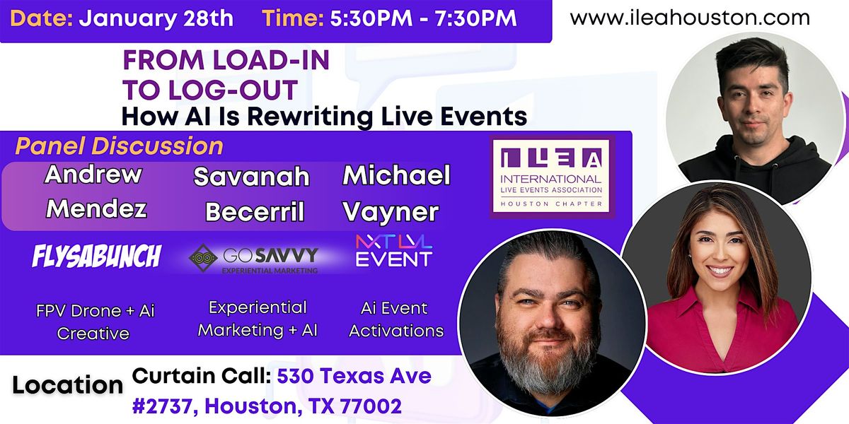 ILEA Houston invites you to an insightful and future-focused panel, “From Load-In to Log-Out: How AI Is Rewriting Live Events,” bringing together industry leaders who are actively shaping how artificial intelligence is transforming the events landscape. Join Andrew Mendez (Flysabunch), Savanah Becerril (Go Savvy Experiential Marketing), and Michael Vayner (NTM Event) as they share real-world applications of AI across experiential marketing, event activations, creative production, and operations.