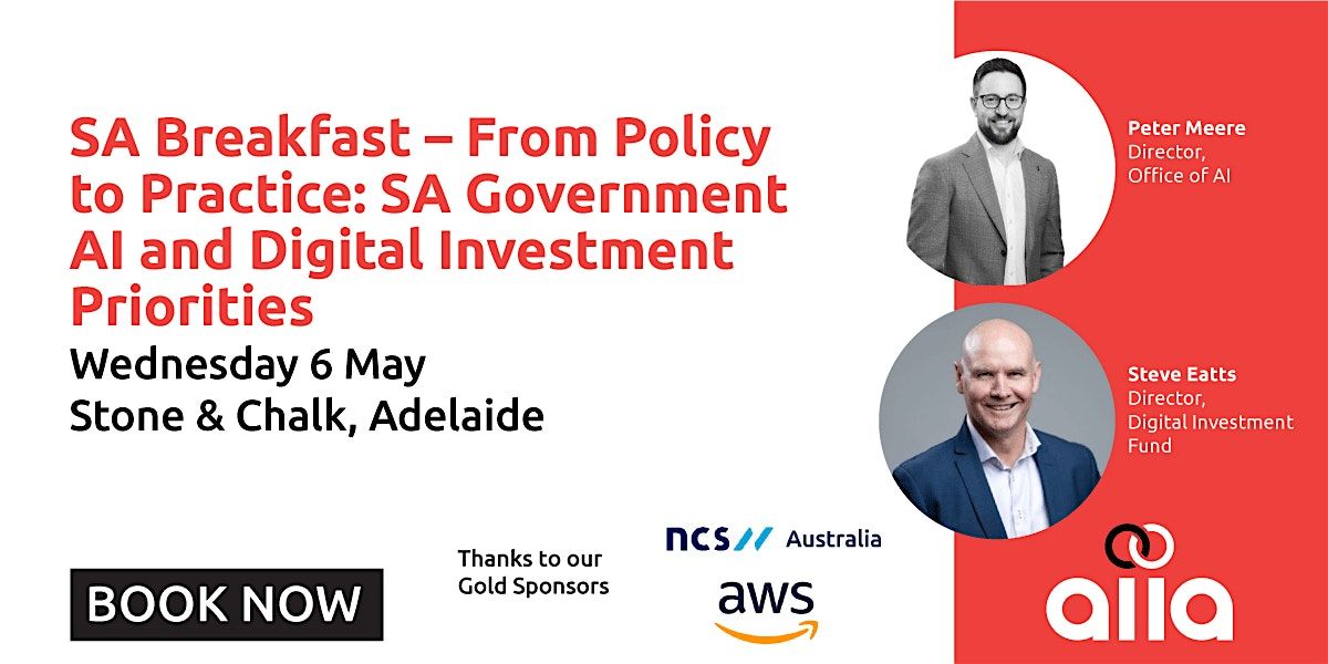 Join the Australian Information Industry Association (AIIA) for an industry briefing with Peter Meere, Director Office for Artificial Intelligence and Steve Eatts, Director Digital Investment Fund as they outline how the South Australian Government is shaping its AI and digital investment priorities.