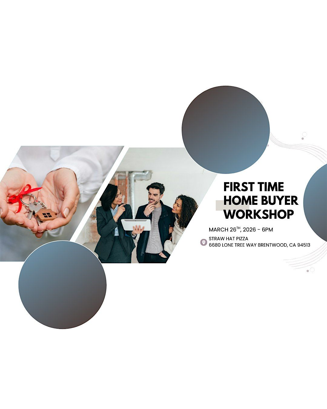 This is a beginner-friendly, no-pressure educational workshop led by local real estate and lending professionals who work with first-time buyers throughout Brentwood and Contra Costa County.