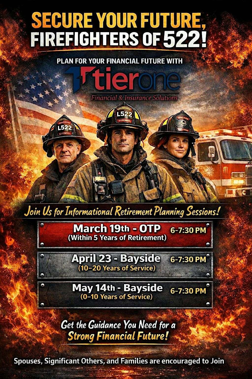 Join us for a focused financial planning session designed for Firefighters of 522 who are within five years of retirement. Learn how to maximize your pension, optimize retirement income, protect your benefits, and create a confident transition into your next chapter. Spouses and families are encouraged to attend.