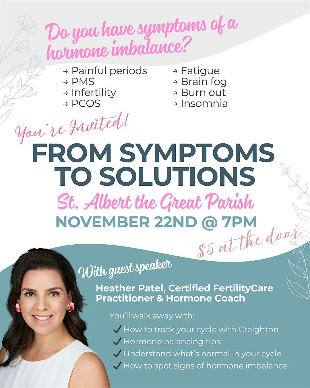 Join us at St. Albert the Great Parish on November 22 at 7 PM for From Symptoms to Solutions, an educational session led by a Certified FertilityCare Practitioner and Hormone Coach.
