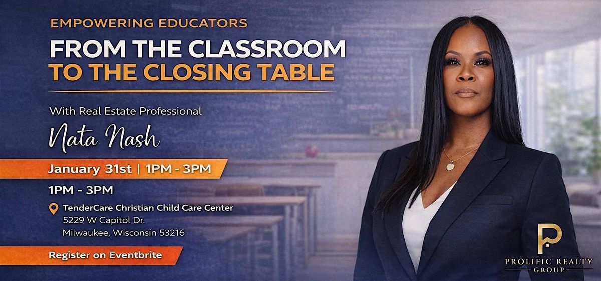 Join Nata Nash of Prolific Realty Group for From the Classroom to the closing table, a free home buyer event designed specifically for educators, teacher aides, paraprofessionals, and childcare professionals. This session is built to address real concerns like student loans, fixed income schedules, credit challenges, and today’s competitive housing market.
