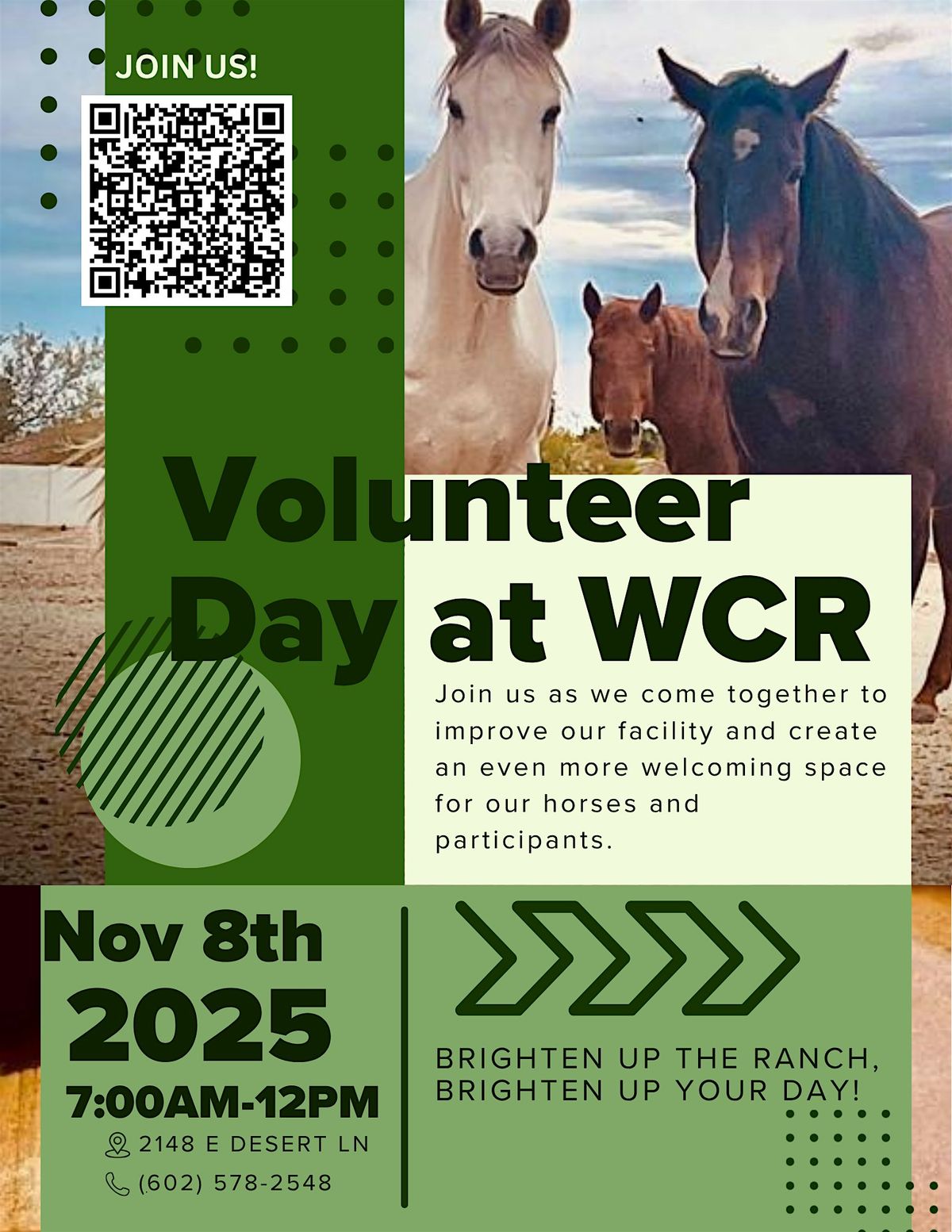 Come join us for a day of giving back at Wildcat Ranch! This in-person event is a great opportunity to roll up your sleeves and help out with various tasks around the ranch. 🌾🐴 Join us as we come together to improve our facility and create an even more welcoming space for our horses and participants. We'll be tackling projects like repairing fences, building shaded structures, refreshing the stalls, repairing the tack room, organizing spaces, cleaning the chicken coop, painting walls, and sprucing up the barn. Whether you're a seasoned ranch hand or just looking to lend a helping hand, every bit of support makes a difference. Let’s work together to make Wildcat Ranch shine! Don't miss out on this chance to connect with nature and make a positive impact in our community. Sign up now to secure your spot!