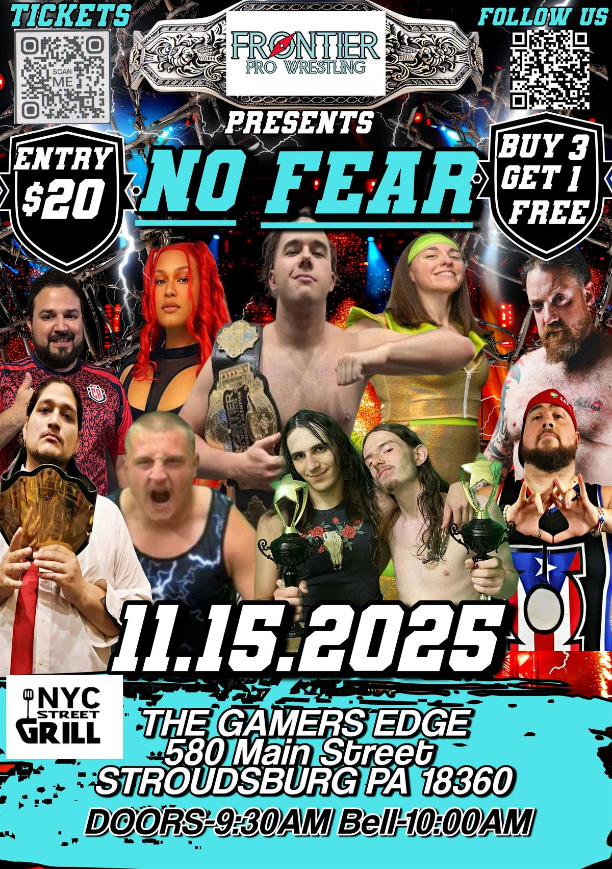 Come witness the excitement and thrill of Frontier Pro Wrestling's new bi monthly flagship show NO FEAR!!! Join us at The Gamer's Edge Comics & Games for an adrenaline-pumping morning of intense wrestling action. Watch as the rising stars of the wrestling world battle it out in the ring for glory and honor. Don't miss out on this epic showdown that is sure to keep you on the edge of your seat!