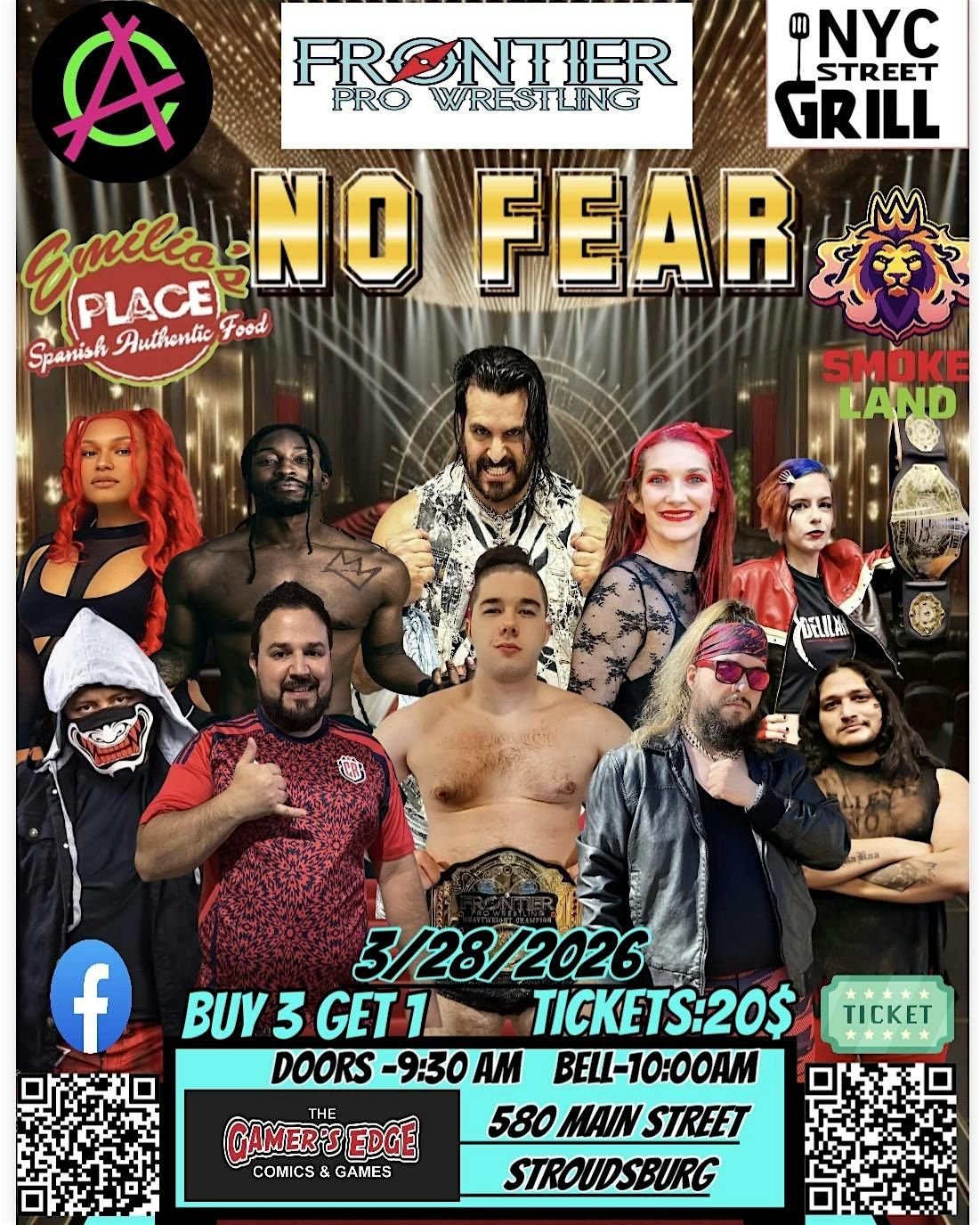 Come witness the excitement and thrill of Frontier Pro Wrestling's new bi monthly flagship show NO FEAR!!! Join us at The Gamer's Edge Comics & Games for an adrenaline-pumping morning of intense wrestling action. Watch as the rising stars of the wrestling world battle it out in the ring for glory and honor. Don't miss out on this epic showdown that is sure to keep you on the edge of your seat!