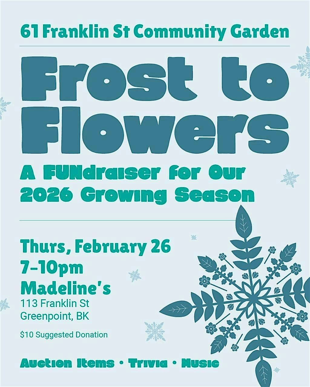 Attendees who donate are entered to win a Garden-themed basket, including 2 memberships to 61 Franklin Street's 2026 growing season, 2 tickets to Brooklyn Botanical Garden and a BBG tote bag AND a $50 Tula gift card