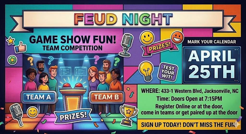 π FEUD NIGHT is coming to Jacksonville! πThink your family or squad has what it takes to win it all? π€π₯Join us for a fun-filled night of games, laughs, and friendly competition!