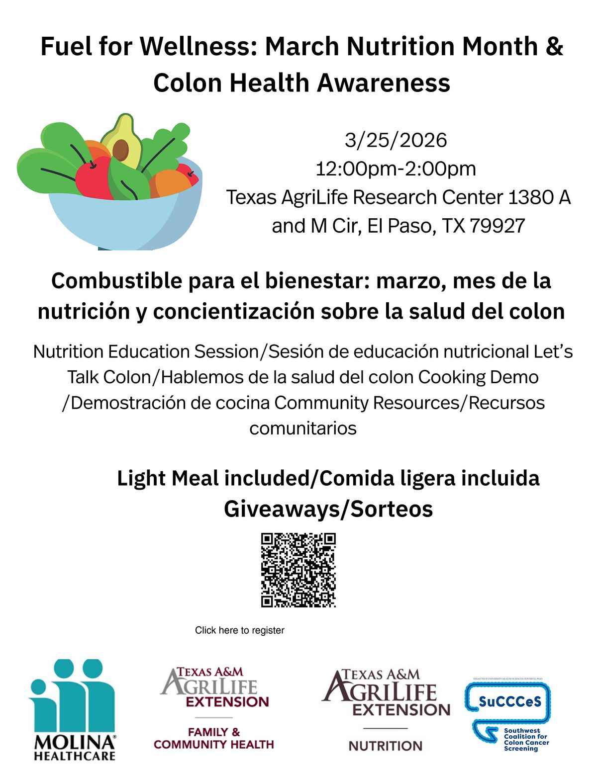 Nutrition Education Session - Let's talk colon. Join us for a cooking demonstration and learn about community resources. Don't miss out on the included light meal & giveaways. Scan QR Code to register.