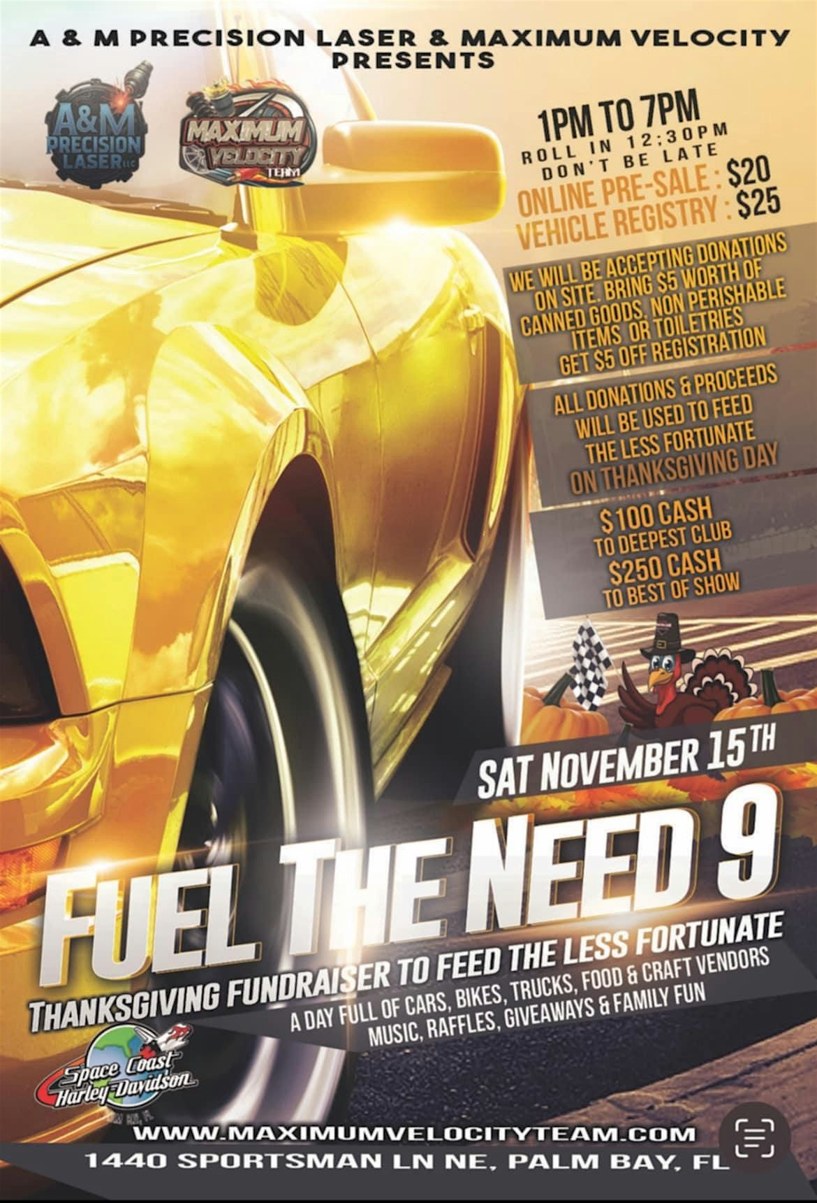 Join us at Space Coast Harley-Davidson on Saturday, November 15 from 1-7pm, for the Fuel the Need 9 Show, a Thanksgiving Fundraiser to feed the less fortunate, presented by A&M Precision Laser & Maximum Velocity.
