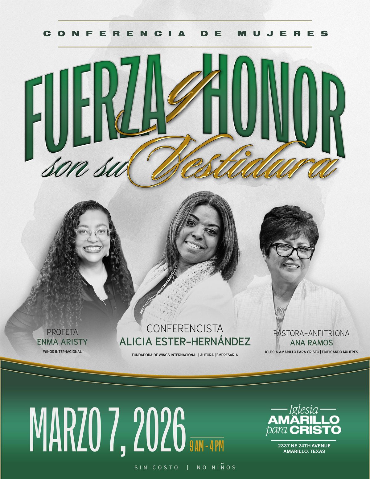 ¡Prepárate para una experiencia increíble en nuestra conferencia presencial! "Fuerza Y Honor Son Su Vestidura" es un evento pensado para mujeres y jovenes valientes que quieren inspirarse, aprender y crecer juntas. ¡Te invitamos a un día poderoso en la presencia de Dios, donde mujeres y jóvenes serán edificadas, fortalecidas y equipadas para caminar con propósito, fuerza y honor!
