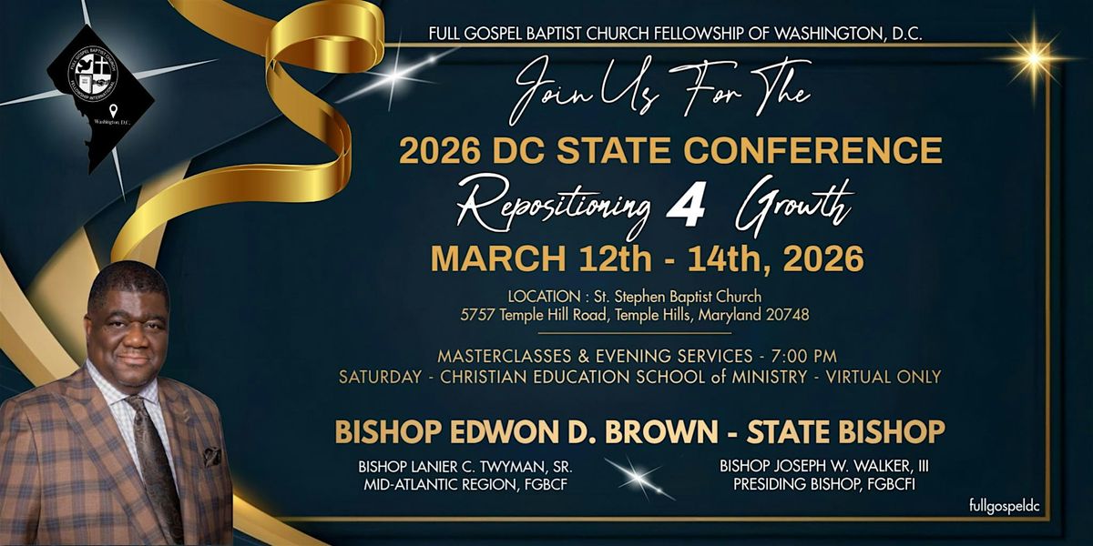 Welcome to the 2026 Full Gospel Baptist Church Fellowship of Washington D.C. State Conference happening at St. Stephen Baptist Church on March 12 and 13, 2026 at 7:00 PM (Eastern Time). Join us for two evenings filled with inspiring messages, uplifting music, and heartfelt fellowship.