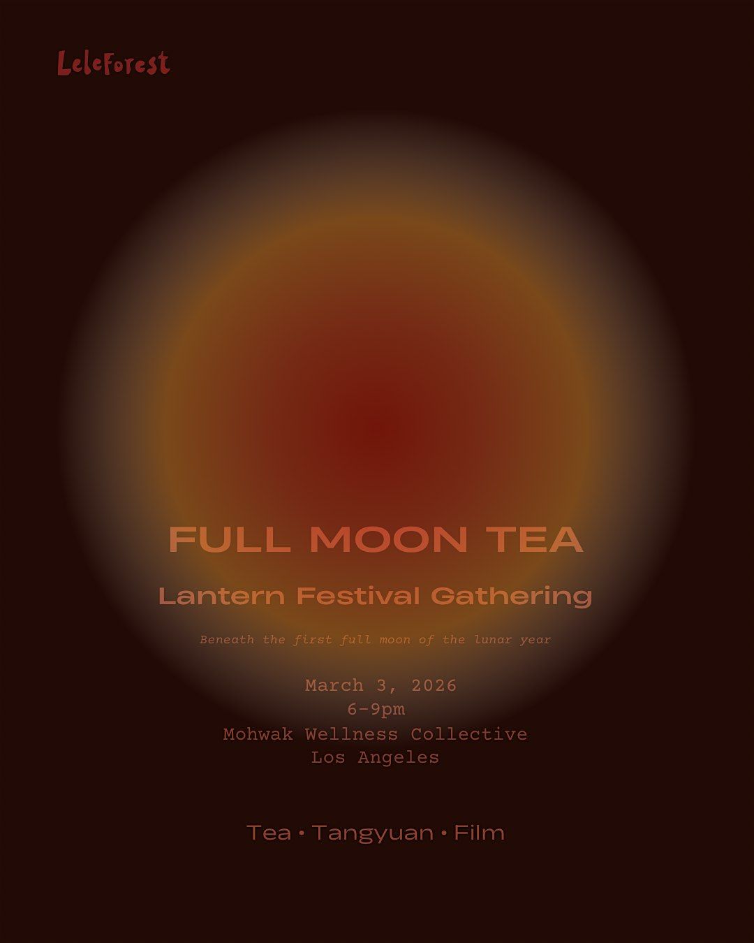 We’ll share Leleforest teas, warm tangyuan (a traditional festival dessert — think soft, delicate mochi in sweet broth), and conversations with friends. As the moon rises, we’ll screen one of our favorite films, In the Mood for Love.
