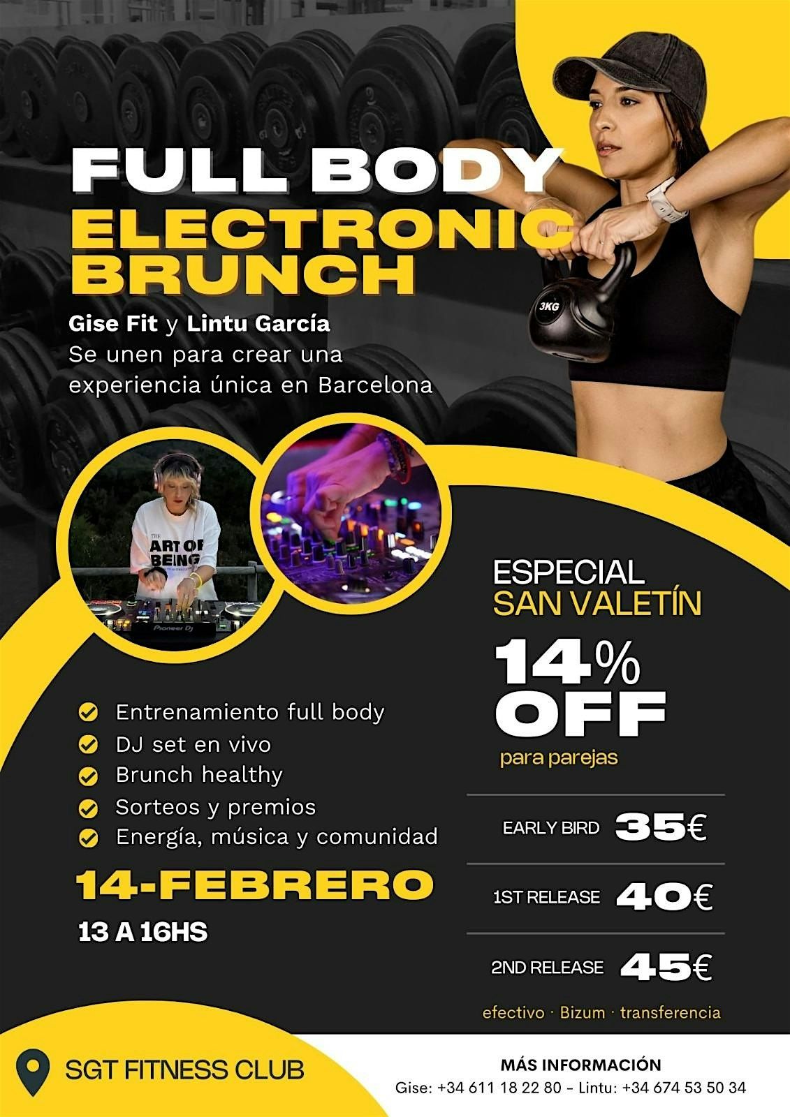 🔥 Full Body + Electronic Brunch: entrenamiento híbrido con DJ en vivo, flow electrónico y brunch healthy. Dos argentinas al mando de la fuerza y el ritmo. Sudás, bailás y conectás. ¿Te sumás? 💥