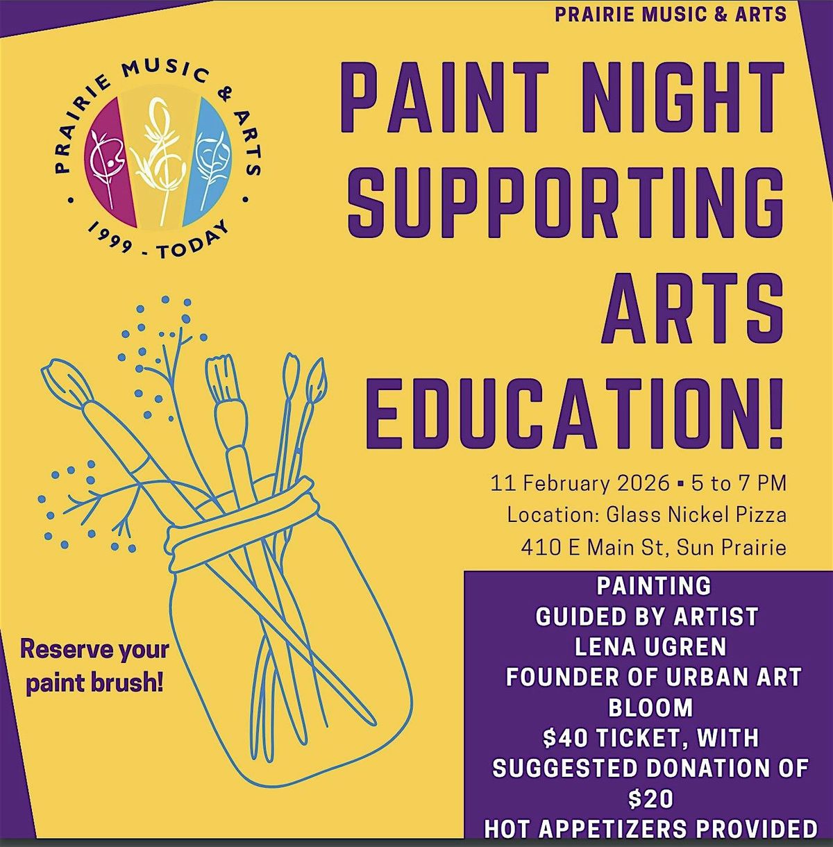 Prairie Music & Arts is excited to offer a Paint Night Supporting Arts Education on Wednesday, February 11 from 5 – 7 pm at Glass Nickel Pizza in Sun Prairie!