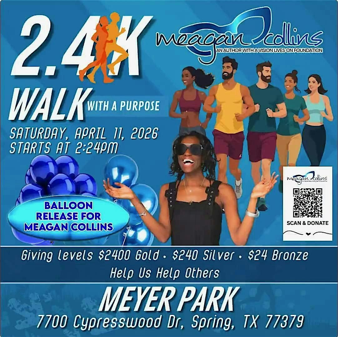 Please join the Meagan Collins Foundation 501(C) 3 organization in our Annual Fun Walk with a purpose and balloon release for a great cause. You can donate at any level by one time at $24.00 Bronze, $240.00 Silver or $2,400.00 Gold level. We thank you with all kindness for your support in advance and we know your tax deductible contributions will go a long way to support the children that receive scholarships, mentoring, counseling and other programs and partnerships.
