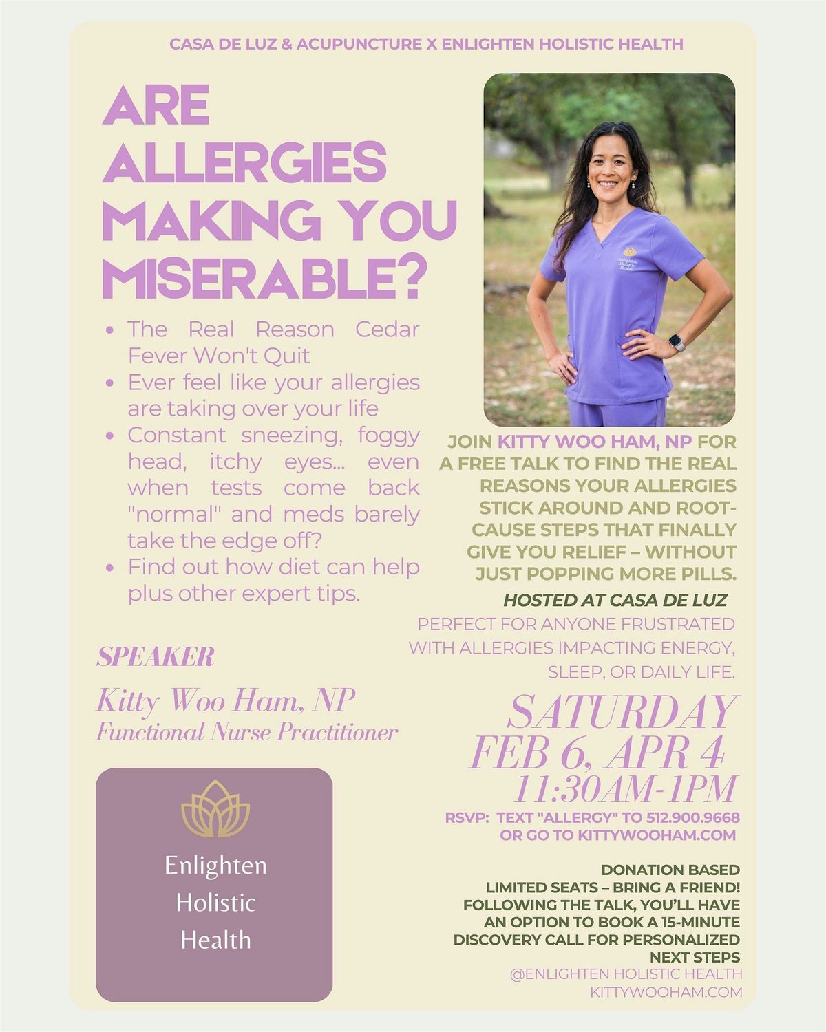 Join Kitty Woo Ham, Functional Medicine NP for a free talk during lunch to find the real reasons your allergies stick around and root-cause steps that finally give you relief – without just popping more pills. Grab lunch and lets talk.