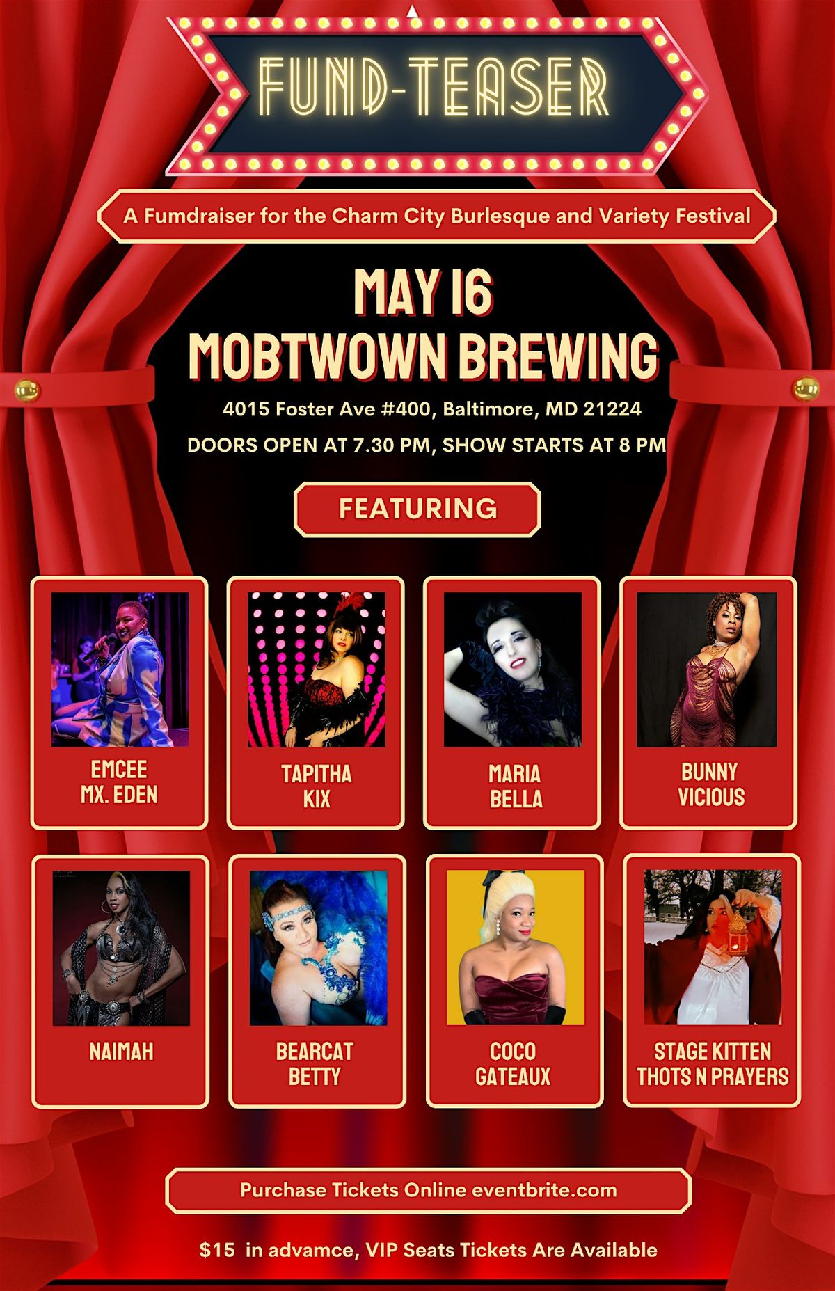 Come join us at Mobtown Brewery for a night of burlesque, variety and fundraising! We're hosting a special event to support the upcoming Charm City Burlesque and Variety Festival.
