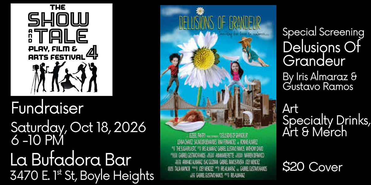 Welcome to the Fundraiser for The Show And Tale Play, Film & Arts Festival 4! Join us at LA Bufadora Bar for a night of fun and fundraising to support our upcoming festival. This event will feature a special film screening, delicious drinks, and art and merch for sale. Come out and show your support for the arts while having a great time with friends and fellow festival enthusiasts. Don't miss out on this opportunity to help make our festival a success!