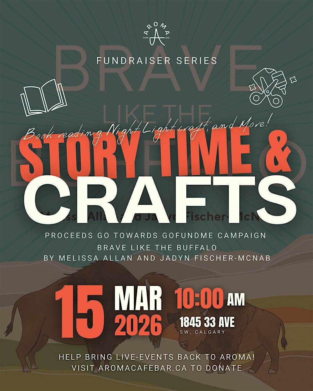 Join us at Aroma Café Bar for Story Time & Crafts, a morning featuring a reading of Brave Like the Buffalo by Melissa Allan and Jadyn Fischer-MaNab. Make a Night Light craft with your little one to remind them that they can create their own light in the dark. Other fun activities available like puzzles and colouring sheets.