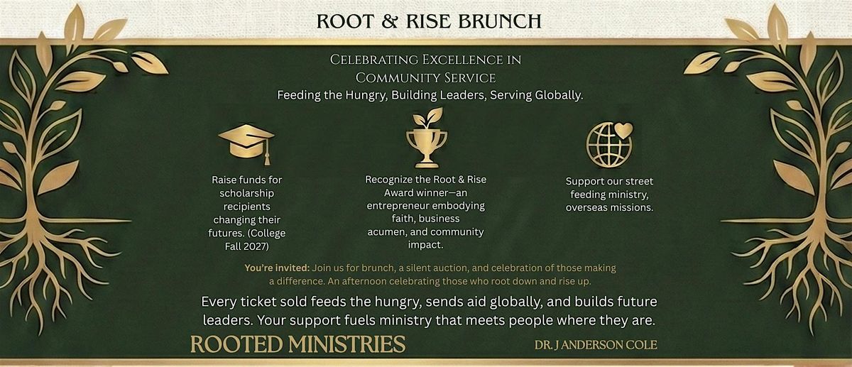 You're Invited!! Join us for brunch, a silent auction and mcelebration of tjosemaking a difference. An afternoon celebrating those who root down and rise!!! Every ticket sold feeds the hungry, provides waarm clothes for the homeless and those in need. your contribution sends funds abroad and builds further leaders right here at home. Your ticket purchase supports ministry for someone you know and can trust. Dr.janderson Cole has a track record for doling Gods work. Matthew 25:45 “He will reply, ‘Truly I tell you, whatever you did not do for one of the least of these, you did not do for me.