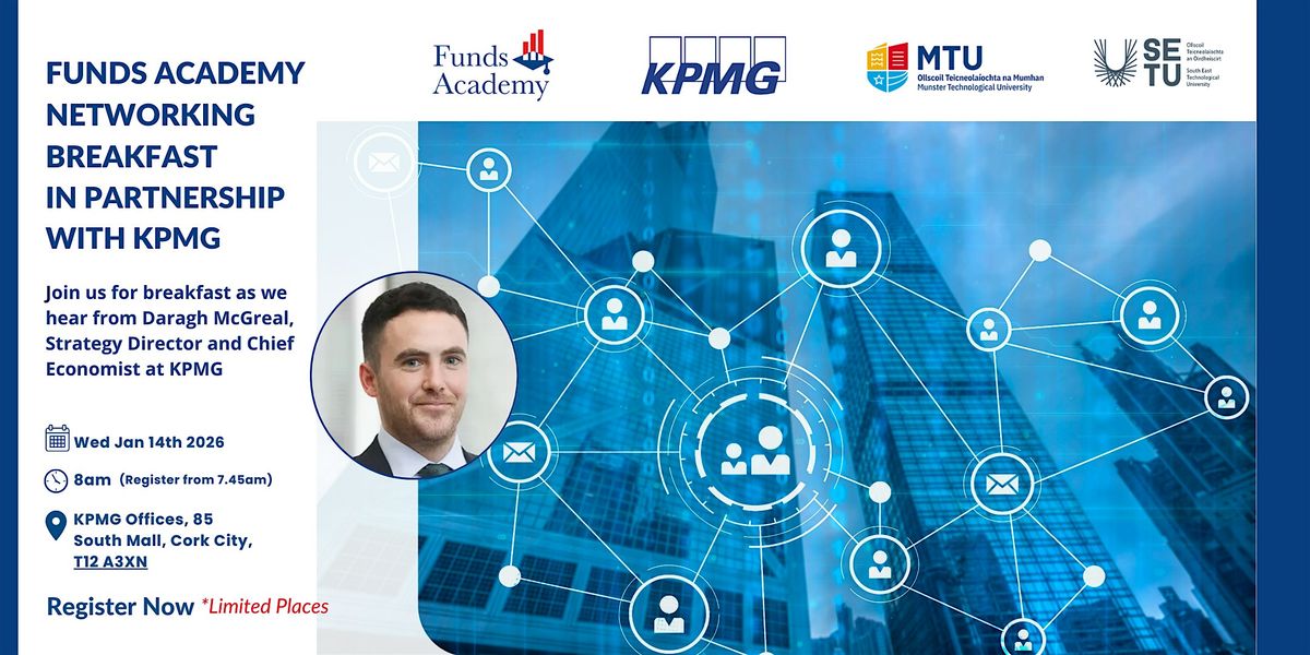 Join us on 14th January for a Funds Academy networking breakfast in partnership with KPMG at KPMG's Cork office, 85 South Mall, Cork. We are delighted to welcome our industry partners and those working within the funds industry across the region to this event.