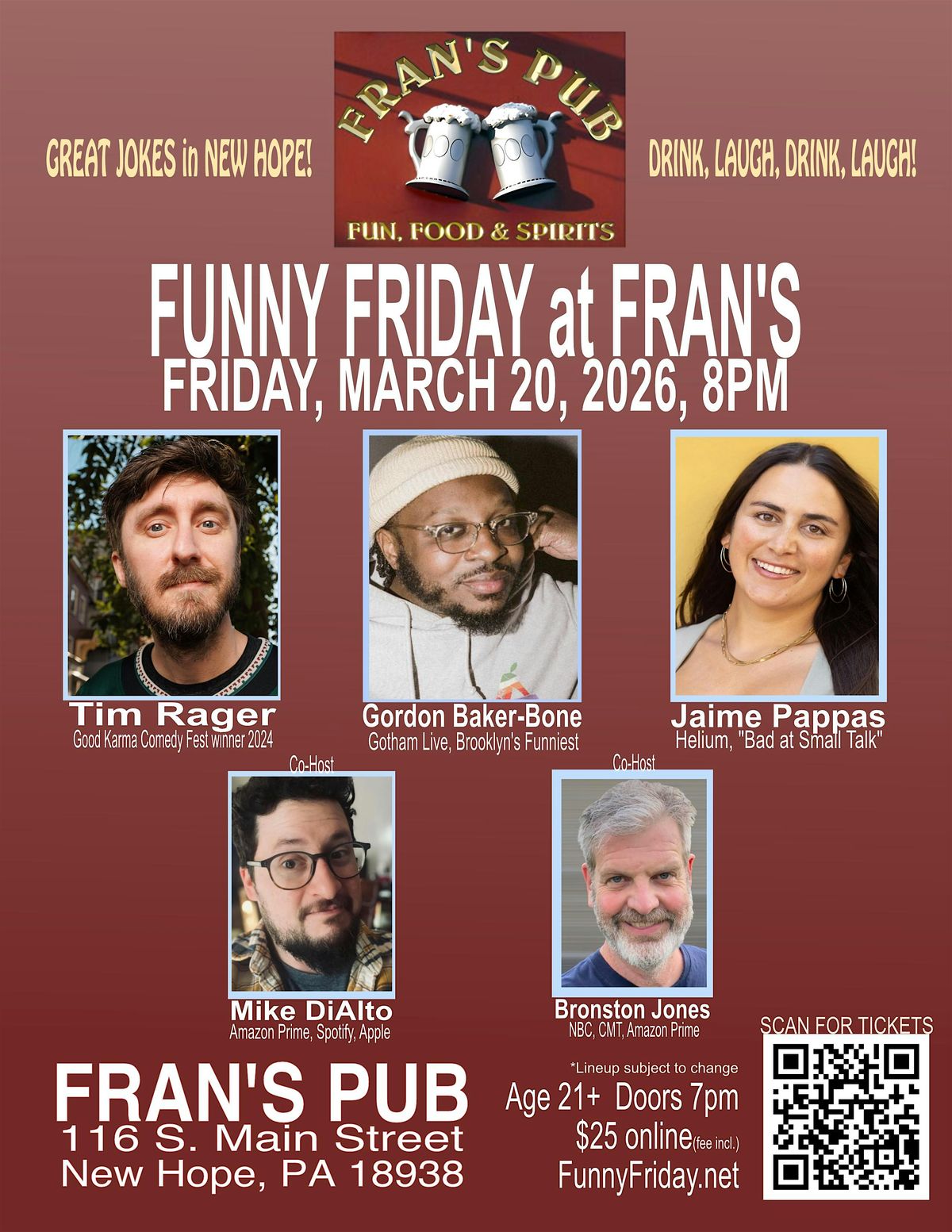 Stand up comedy at Fran's Pub on Main. Gordon Baker-Bone, Jaime Pappas and Tim Rager join hosts Mike DiAlto & Bronston Jones*.