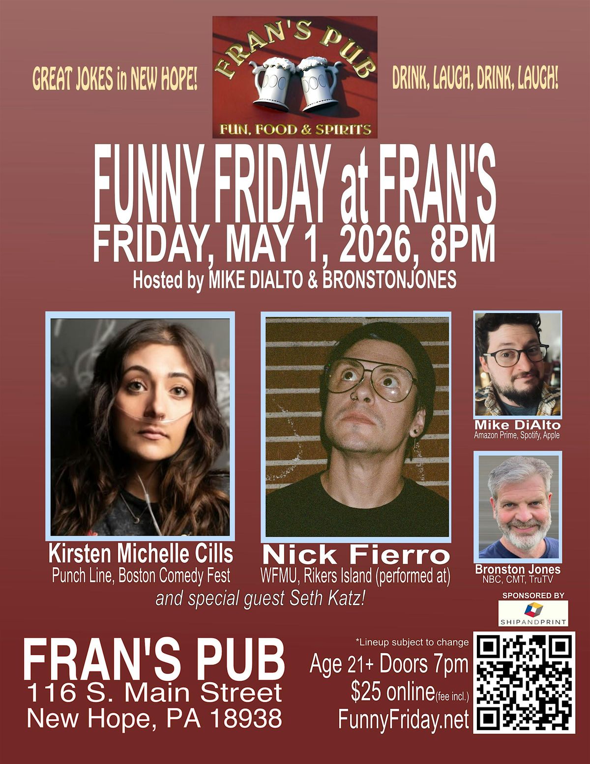 Stand up comedy at Fran's Pub on Main Street. Kirsten Michelle Cills (Punch Line), Nick Fierro and Seth Katz join co-hosts New Hope's Mike DiAlto & Funny Farm Yardley's Bronston Jones.*