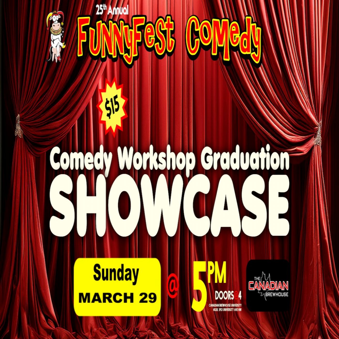 FunnyFest COMEDY Workshop Graduation Show in Calgary / YYC on Sunday, MARCH 29 @ 5 PM to 630 PM Laugh with student comedians! See 2 headline comedians bookend the hilarity, Prizes; Great Food and Beverages, crazy and funny.