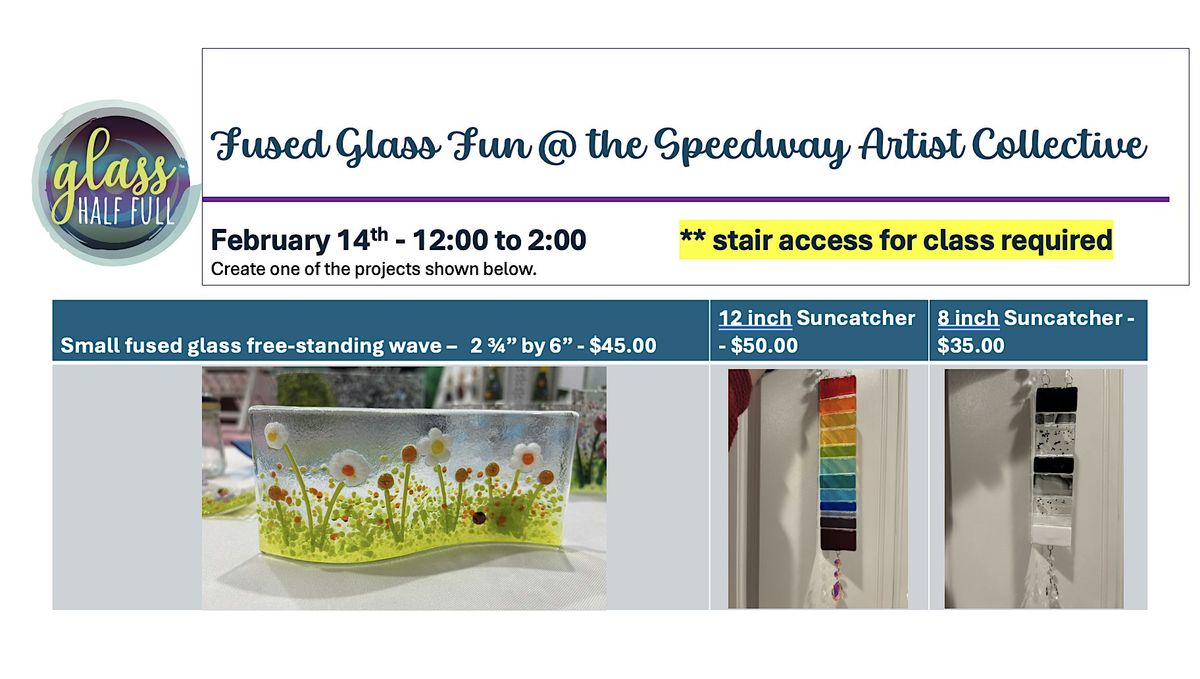 Welcome to Fused Glass Fun on Shop Small Saturday! Join us at SPEEDWAY ARTIST COLLECTIVE for a afternoon of creativity and community. Let's get together and create beautiful fused glass pieces. No experience needed - Janette will guide you every step of the way. Bring your friends and unleash your inner artist! Don't miss out on this opportunity to make something special.